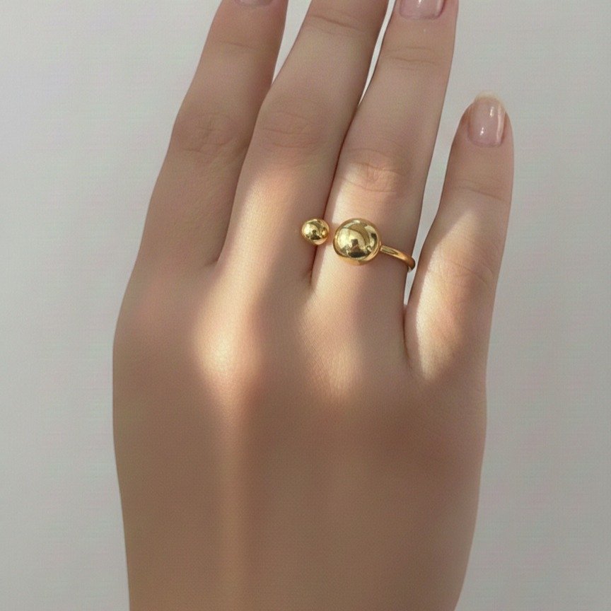 Anel de design aberto e minimalista, apresentando duas esferas polidas de tamanhos distintos em suas extremidades. Sua estrutura moderna e contínua abraça o dedo de forma leve, proporcionando um visual contemporâneo com um toque de volume geométrico. O acabamento em alto brilho realça a curvatura das esferas, tornando-a uma peça indispensável para quem busca sofisticação e versatilidade em um único acessório.