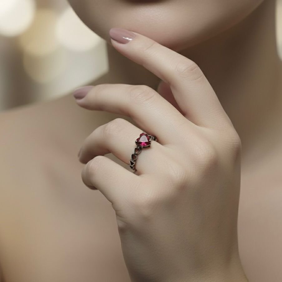 Anel solitário romântico em Prata 925 com acabamento envelhecido no aro, que ressalta os detalhes trabalhados em pequenos corações vazados. O destaque é a pedra central, uma zircônia no formato de coração na cor vermelha, cravada em garras que se assemelham a uma coroa. Uma joia delicada, perfeita para expressar amor e paixão com um toque vintage.