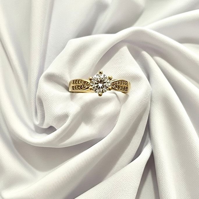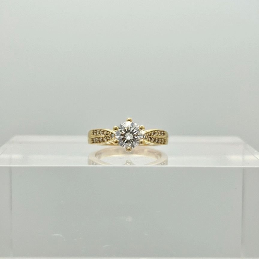 Anel solitário clássico com uma zircônia central redonda em destaque, fixada por 6 garras. A haste é adornada em suas laterais com pequenas micro zircônias cravejadas, adicionando um brilho extra e sofisticado à peça.