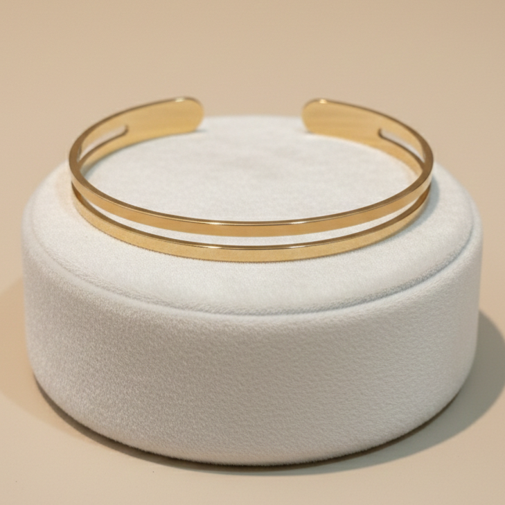 Bracelete aberto com um design minimalista e contemporâneo, formado por dois aros finos e paralelos, unidos nas extremidades. Seu acabamento liso e altamente polido confere uma elegância discreta e moderna ao pulso, sendo uma peça versátil que se encaixa em qualquer mix ou pode ser usada sozinha como ponto de luz. Uma peça atemporal, perfeita para adicionar um toque de sofisticação.