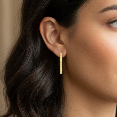 Brinco de pino em formato de barra vertical alongada, com uma textura elegante (efeito diamantado ou areia) que cobre toda a peça. Este acabamento proporciona um brilho sofisticado e fosco, destacando a geometria da peça. É o acessório ideal para quem aprecia o minimalismo e busca um toque de estilo e modernidade no dia a dia.