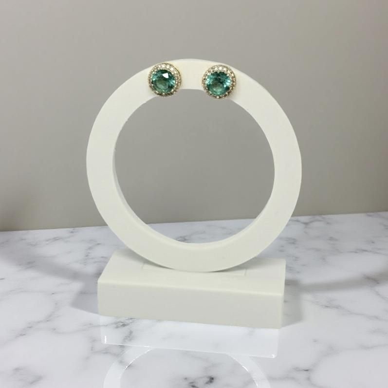 Detalhes: Zircônia central verde em formato redondo com cravação de micro zircônias ao redor.