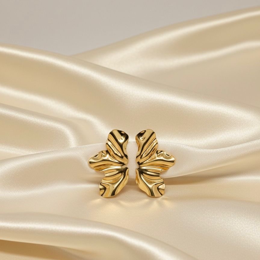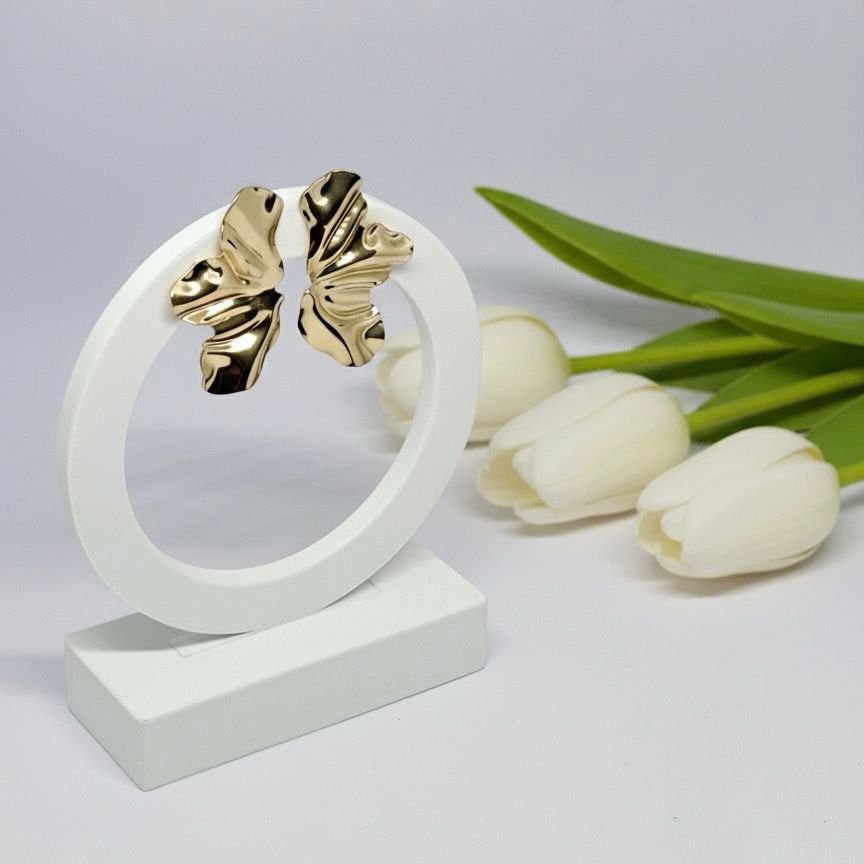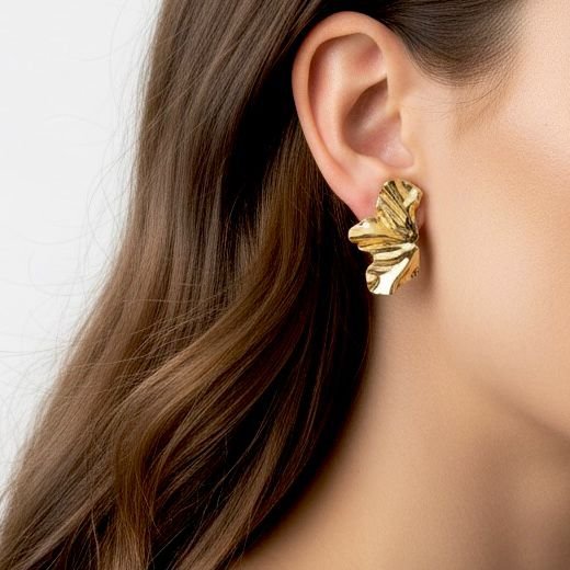 Brinco de pino sofisticado com um design contemporâneo que remete à forma de uma folha ou pétala estilizada. Sua superfície é trabalhada com uma textura irregular (efeito “amassado”), que capta a luz e confere um visual escultural e orgânico de alto-impacto. Uma peça atemporal, perfeita para adicionar volume, modernidade e luxo ao look.
