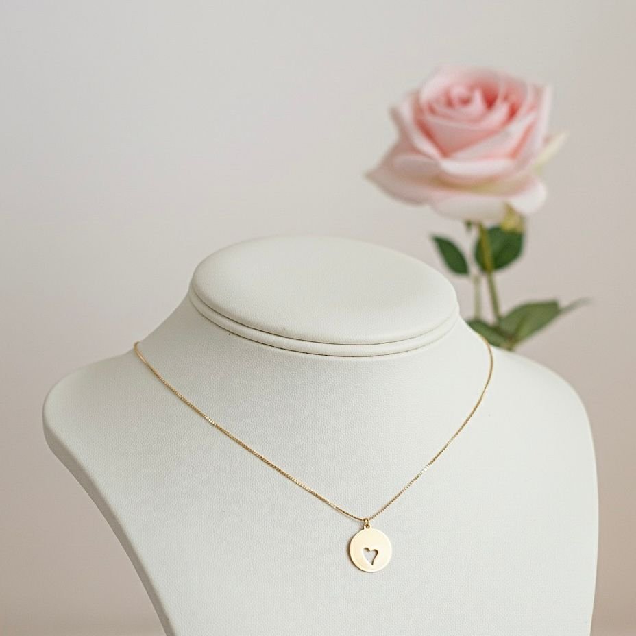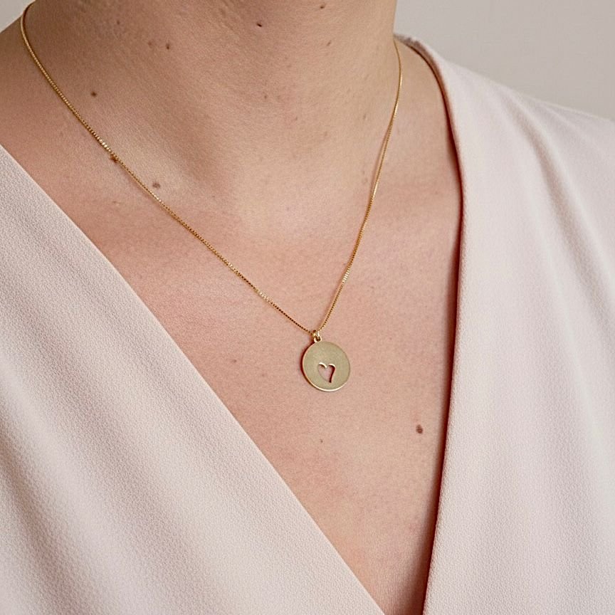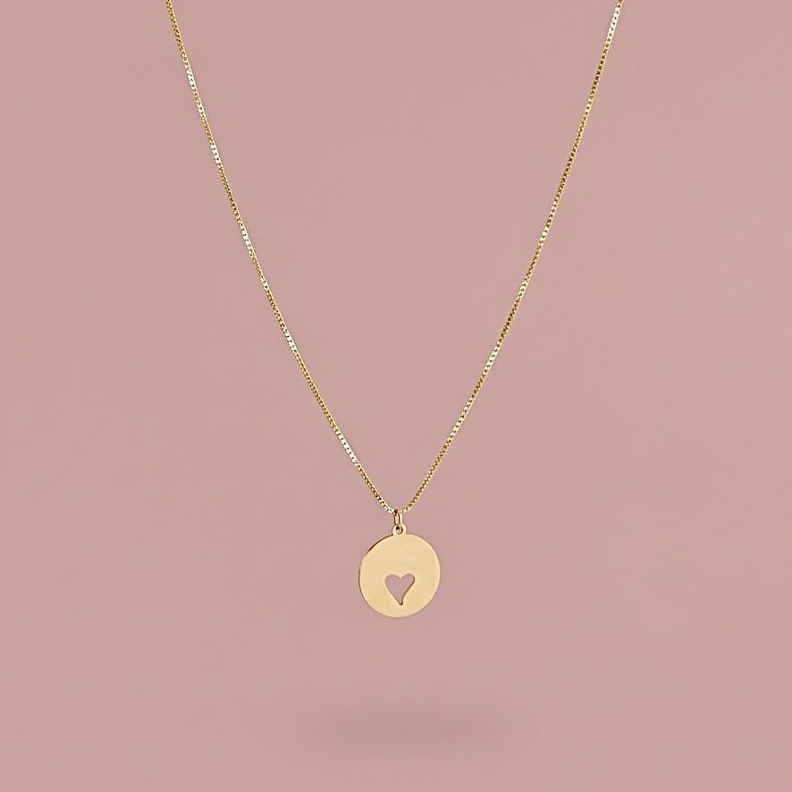 Colar de corrente veneziana fina com um pingente em formato de medalha redonda e lisa. O charme da peça está no coração vazado no centro da medalha, que oferece um toque minimalista e romântico. É uma joia discreta, perfeita para o dia a dia, simbolizando carinho e afeto.