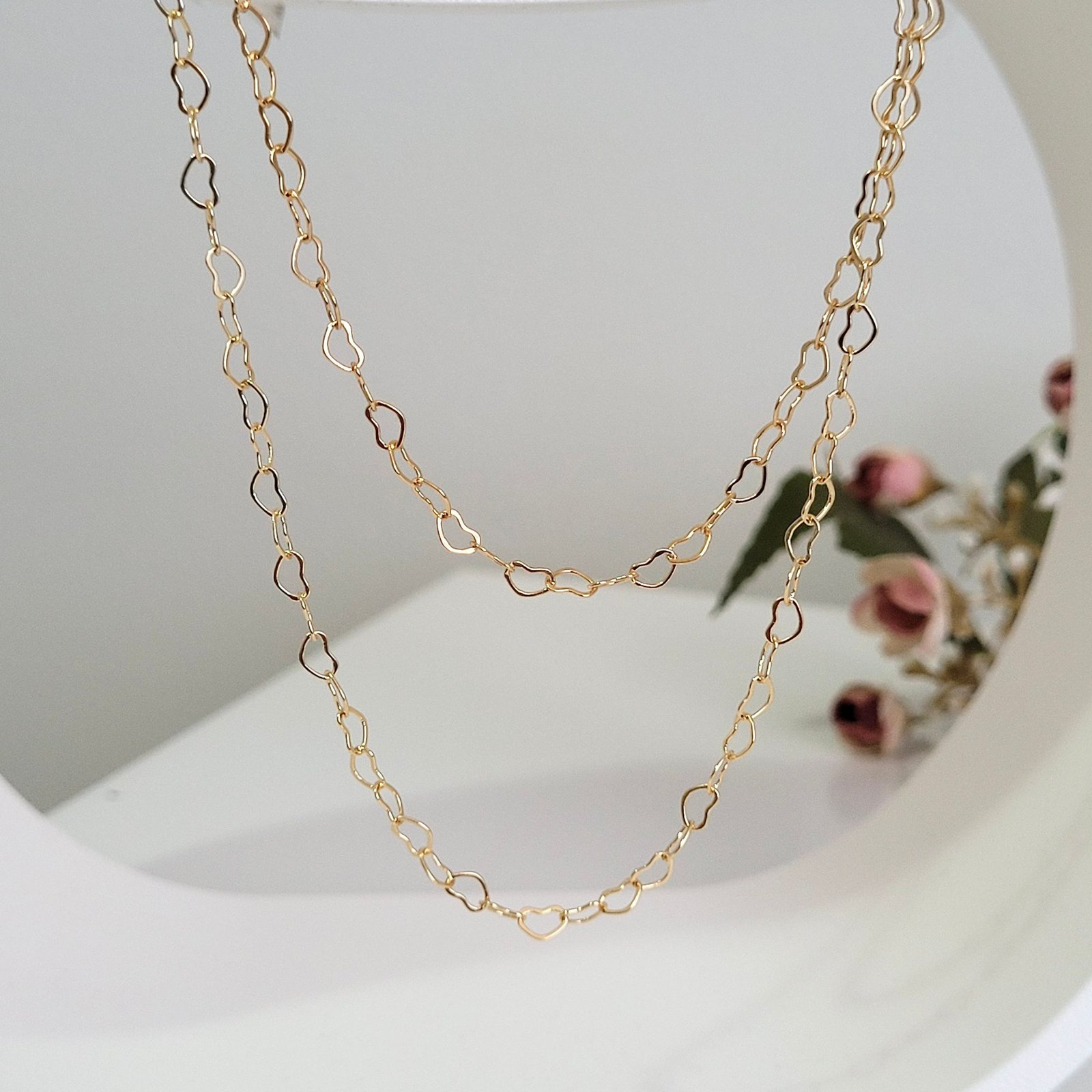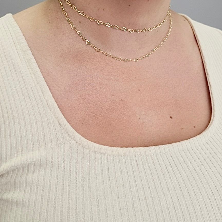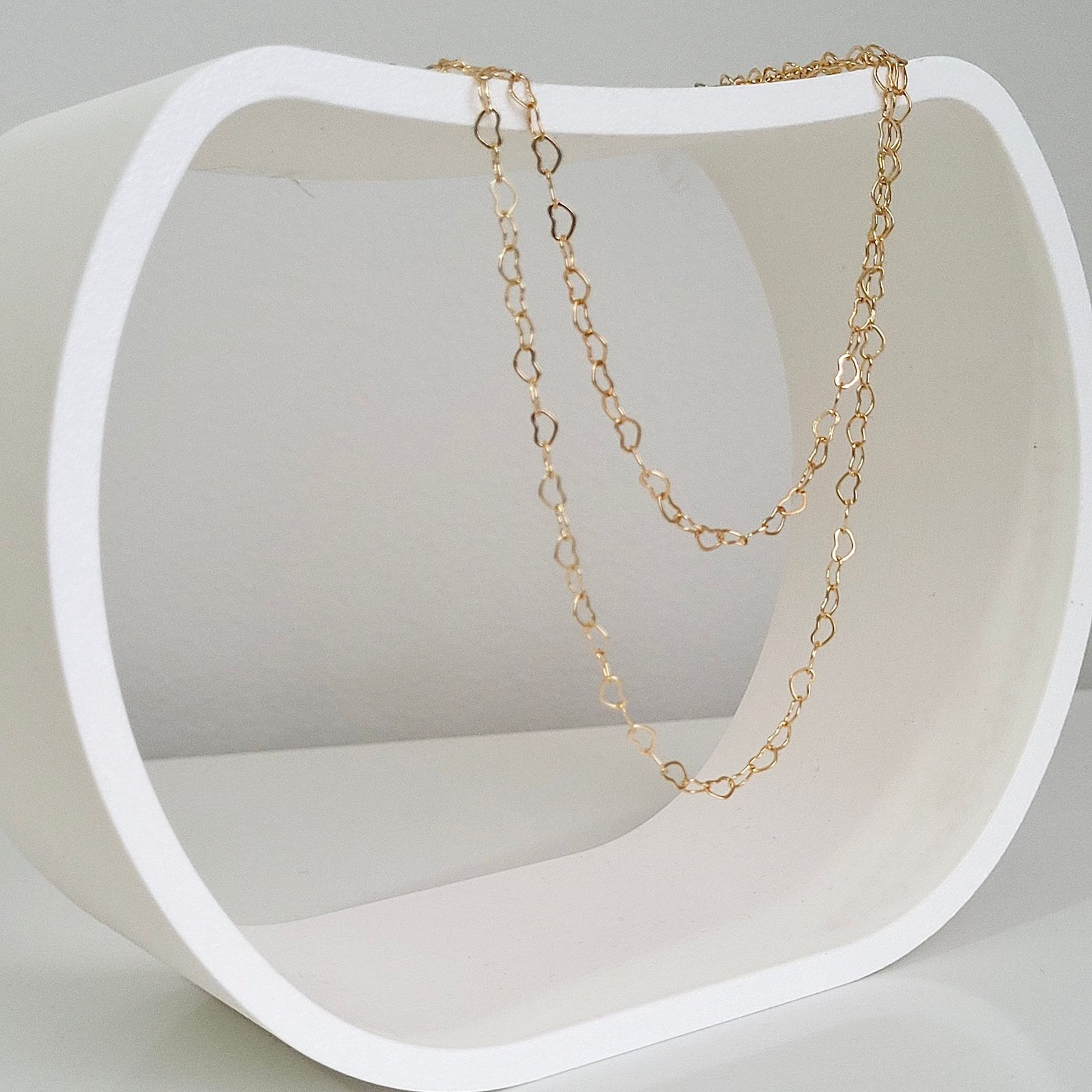 Corrente de elos interligados onde cada elo tem o formato de um coração vazado e polido. Esta peça é uma variação moderna das correntes de elos maiores, unindo a tendência do design arrojado com o simbolismo do amor e da feminilidade. Pode ser usada como gargantilha ou colar mais longo, dependendo do comprimento.