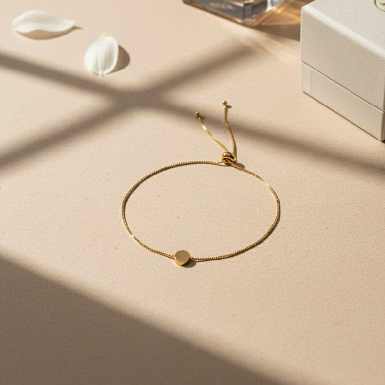 Pulseira moderna e minimalista, composta por uma fina corrente e um pequeno pingente em formato de disco liso central. Seu grande diferencial é o fecho ajustável (slider ou gravata), que permite o ajuste perfeito para qualquer pulso, garantindo conforto e segurança. É uma peça sutil, mas que adiciona um toque contemporâneo e elegante ao visual.