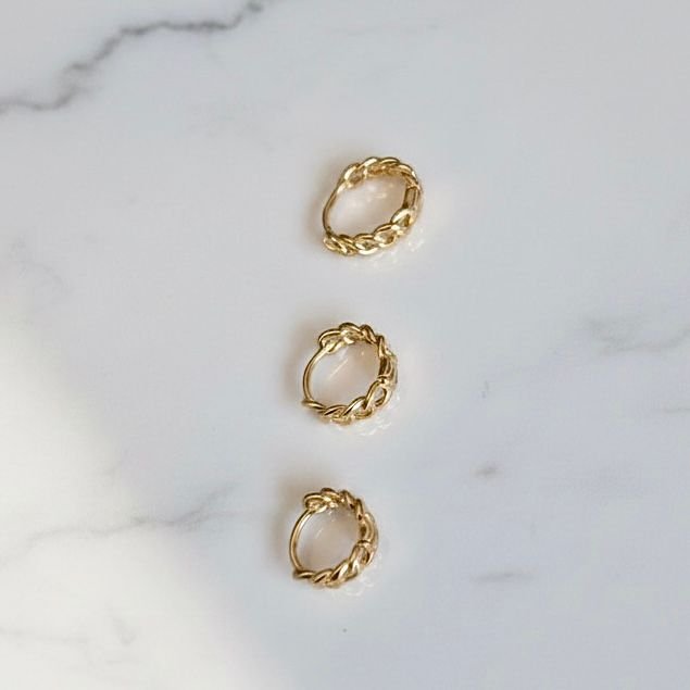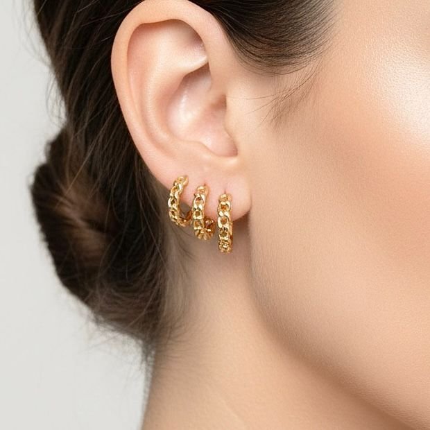 Este trio de argolas apresenta um design moderno e texturizado, composto por elos entrelaçados que remetem à estética das correntes clássicas. Com três tamanhos progressivos, o conjunto oferece versatilidade e estilo, permitindo criar um visual de “orelha cheia” com harmonia e sofisticação. O acabamento polido de alto brilho garante que as peças reflitam a luz de maneira marcante, sendo o acessório indispensável para produções contemporâneas.