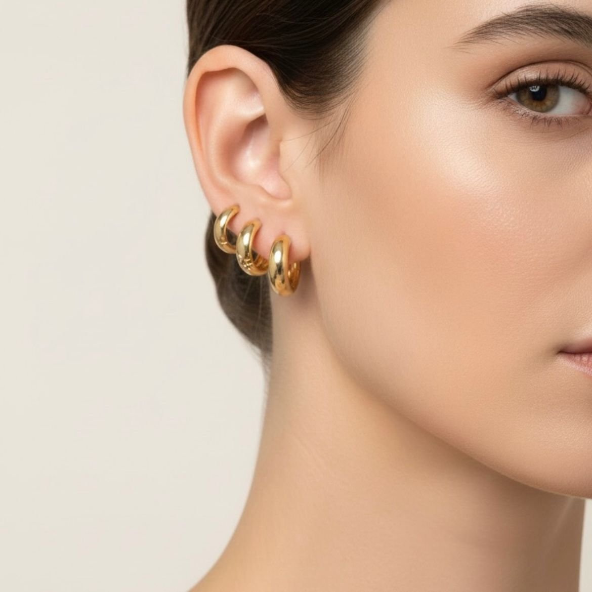 Este trio de argolas é a escolha ideal para quem busca o equilíbrio entre o clássico e o design arrojado. Com um formato abaulado e encorpado, as peças possuem uma superfície lisa e polida que proporciona um brilho espelhado de alta intensidade. O fechamento em click garante praticidade e um ajuste perfeito à orelha, enquanto a progressão de tamanhos permite criar um mix harmonioso e cheio de personalidade, elevando instantaneamente qualquer produção.